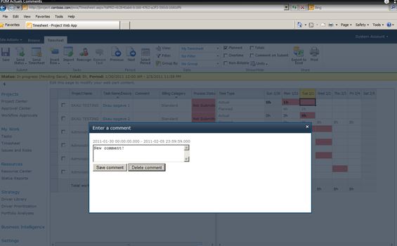 If you are using the timesheet functionality for invoicing purpose you might run in to trouble when you need an overview on what your teammembers have done on a dask on a specific date. The reason to this issue is that the timesheet only allows comments to be captured for the entire period pr. task. My company Projectum (www.projectum.dk) have now develop a simple module/add-on that enables you to right click on a cell in the timesheet grid, allowing you to enter your comments. For reporting purpose, all daily comments/notes will be saved to the Project Server database (SQL) in an already existing table.