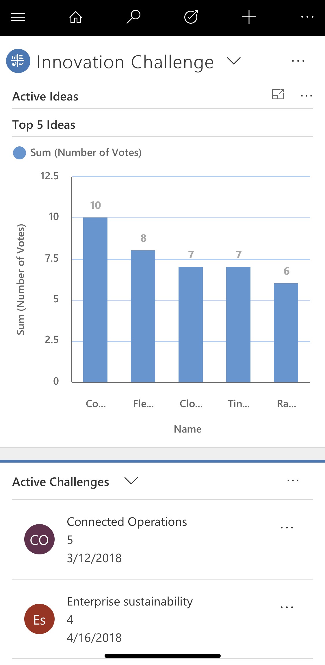 This is the “Innovation Challenge” PowerApp landing page. From here you get a quick overview on active challenges and the ideas that are submitted. It also gives you an overview on top ideas based on user ratings. You can easily customize the page or create new dashboards in just a few minutes. If needed, data can also be accessed through Power BI by connected to the “Common Data Service” as the source.